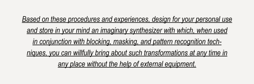 Lucier’s instruction shifts the act of listening and the making of a piece inward: it proposes an exercise of the mind and of perception, one that no longer depends on instruments, technologies or sound itself, but on the capacity to imagine listening and transform internally.